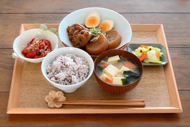 一汁三菜とは、日本人の主食である「ご飯」に、「汁物」と3つの「菜(おかず)」を組み合わせた献立のことを言います。三菜の中でも、1品は「主菜」と言って動物性や植物性のたんぱく質がメインのおかずに、残りの2品の「副菜」は野菜や海藻がメインのおかずします。そうすることで、五大栄養素である炭水化物(糖質)、脂質、タンパク質、ビタミン、ミネラルが取れるようになる、ということからこの言葉が作られました。