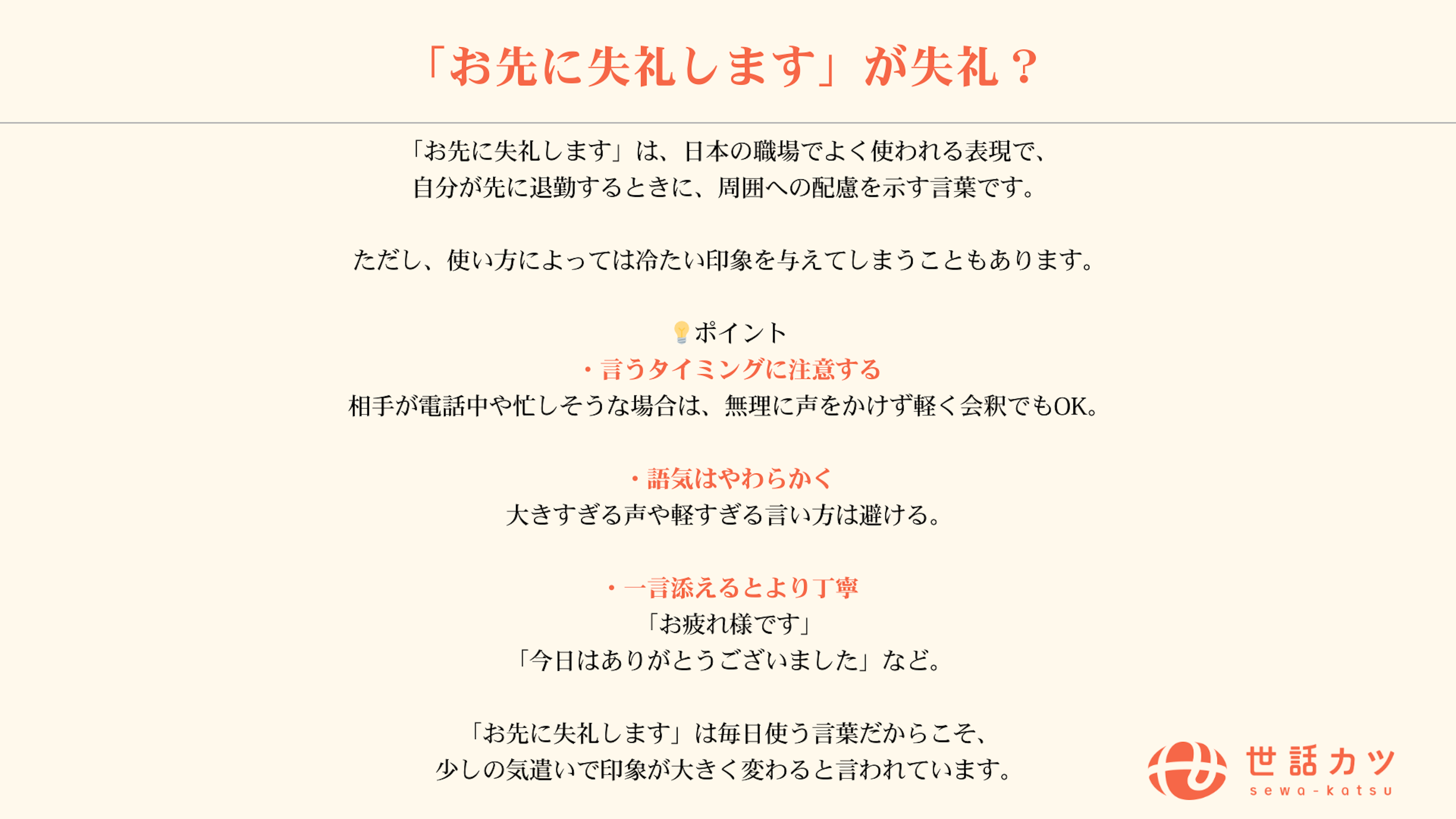 「お先に失礼します」は毎日使う言葉だからこそ、 少しの気遣いで印象が大きく変わると言われています。